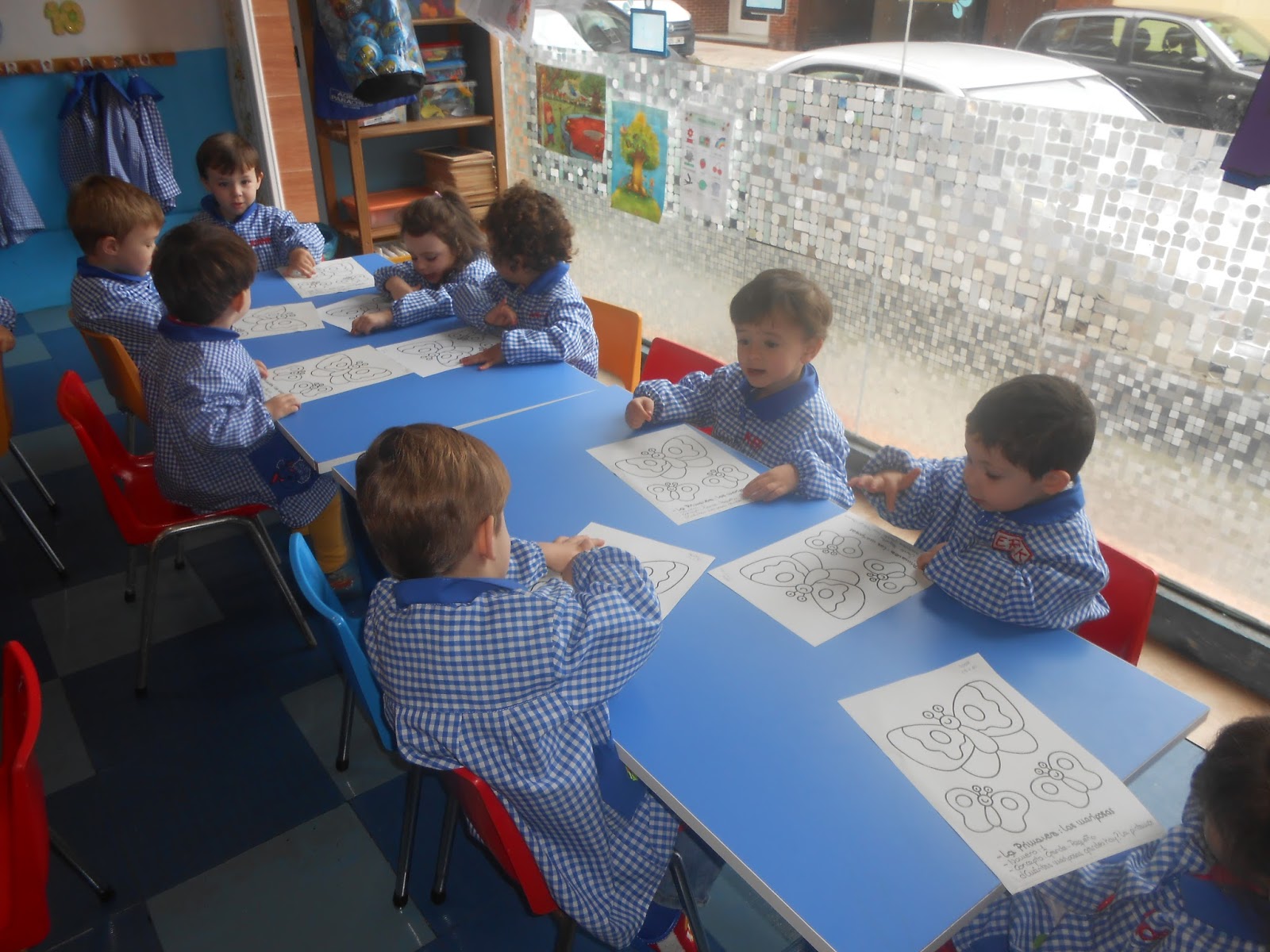 En la ficha de hoy trabajamos variedad de conceptos: números ( 1 y 2) , insectos ( mariposa) , grande/ pequeño , concepto espacial ( arriba / abajo) . Debían buscar donde estaban dos mariposas y pintar solo la mariposa grande.